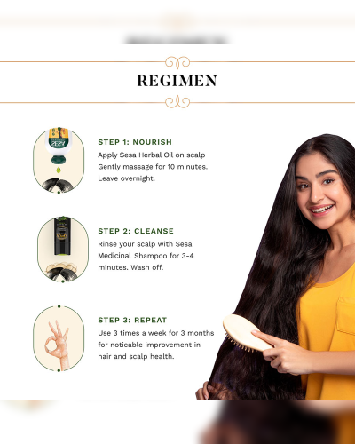 Apply massage gently for 10 minutes. Keep it for 30 mins to 1 hour or overnight, then rinse it with Sesa Ayurvedic Shampoo. Repeat this process every 2-3 days for best results.