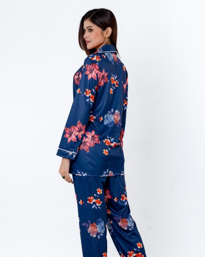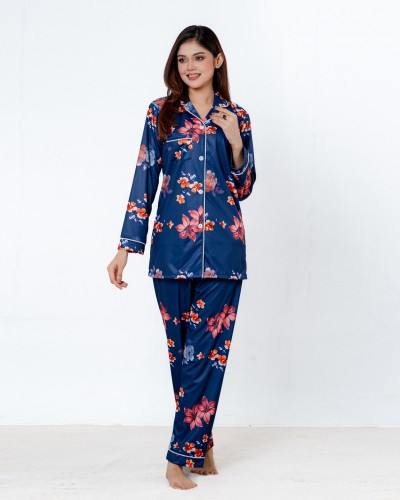 Women’s Luxurious Printed 2 Pcs Satin Night Suit (Navy)